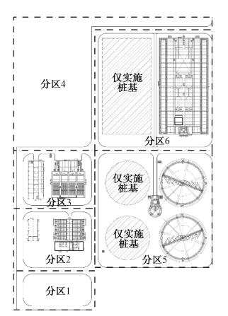 根據本工程污水處理廠項目特征,擬充分結合擴建廠區的構筑物布置方案、綠化布置方案、道路走向等,有效利用污水處理廠污水處理設施能力,實現擴建廠區用地范圍內的年徑流總量和徑流污染控制。結合地面高程、道路坡向及功能分區,將擴建廠區分為6個海綿分區,具體情況如表2和圖1所示。普通不透水道路面積為4 274.9 ㎡,透水路面面積為3 679.5 ㎡,普通屋面、封閉水池面積為3 727.8㎡,綠地面積為17459.7 ㎡,(類)開敞水池面積為8 685.4 ㎡,預留樁基區域面積為8 685.4 ㎡,遠期待建區域面積為12 489.5 ㎡,區域綜合徑流系數為0.445 3。