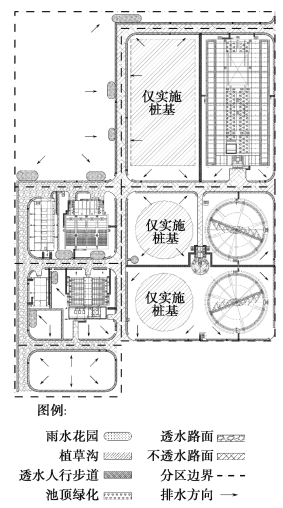 綜合考慮現狀改造工程量、實施難度、展示效果、工程效果及工程投資等因素,經綜合評估,本次擴建工程海綿城市設施實施范圍確定為擴建廠區。在擴建廠區進行示范建設后,可以結合運行效果及積累的養護管理經驗,后續工程中擇機在現狀廠區內進行推廣應用。