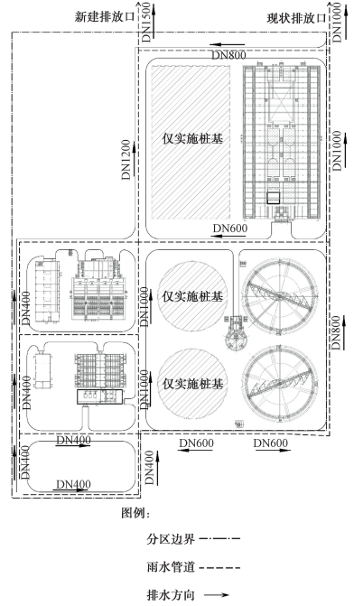 結合分區內平面布局、設施分布以及上文的海綿設施選型,對各個分區因地制宜地進行海綿設施布置,如圖2所示。其中道路兩側的植草溝主要收集道路雨水及周邊地塊雨水,地塊內部的植草溝和雨水花園主要收集地塊內的雨水徑流和經斷接的屋面雨水,池頂綠化則主要設置于生物反應池厭缺氧池上方,用于收集池頂雨水。每個分區中起主要作用的海綿設施工程量如表3所示。擴建廠區雨水管道按照重現期為5年設計,雨水管網分布如圖3所示。超出海綿設施滯蓄能力的雨水通過溢流井溢流至雨水管道中,經現狀 DN1000和新建 DN1500排放口排入廠區北側河道中。