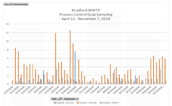 Bradford污水廠采用氧化溝系統,包含兩個較小的串聯厭氧池、一個較大的缺氧池,以及一個氧化溝。氧化溝有兩個曝氣器(20馬力),并配有變頻驅動器 (VFD)。
