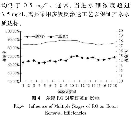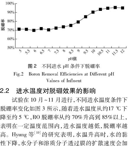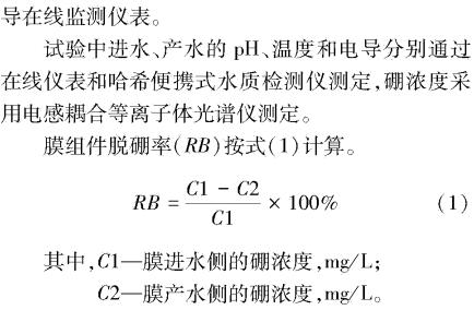 摘要:在海水淡化廠RO膜組上進(jìn)行生產(chǎn)性試驗(yàn),探究pH、溫度、多級(jí)反滲透和膜組件等因素對(duì)RO脫硼效果的影響。試驗(yàn)結(jié)果表明,進(jìn)水pH值在8.5-10.5,RO脫硼率隨pH增大而州高,可以達(dá)到95%左右;隨著進(jìn)水溫度從約17℃下降至約5℃,RO脫硼率從約 70%升高到 85%以上;在試驗(yàn)條件下,二級(jí)RO 比例為45%,采用兩級(jí)RO工藝相對(duì)一級(jí)RO脫硼率高出約20%;不同品牌型號(hào)的RO膜在同等工藝和進(jìn)水條件下,脫硼率存在較大差異,通過(guò)PEG處理性能下降的RO膜,一級(jí)RO脫硼率可以提高約15%。