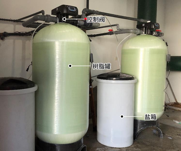 原水在一定的壓力(0.2-0.6Mpa)、流量下,通過控制器閥腔,進入裝有離子交換樹脂的容器(樹脂罐),樹脂中所含的Na+與水中的陽離子(Ca2+,Mg2+,Fe2+……等)進行交換,使容器出水的Ca2+,Mg2+離子含量達到既定的要求,實現了硬水的軟化。